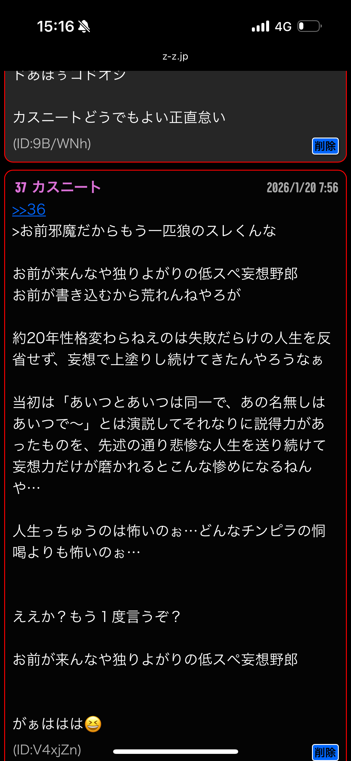 当初は「あいつとあいつは同一で、あの名無しはあいつで~」とは演説してそれなりに説得力があったものを、先述の通り悲惨な人生を送り続けて妄想力だけが磨かれるとこんな惨めになるねんや…