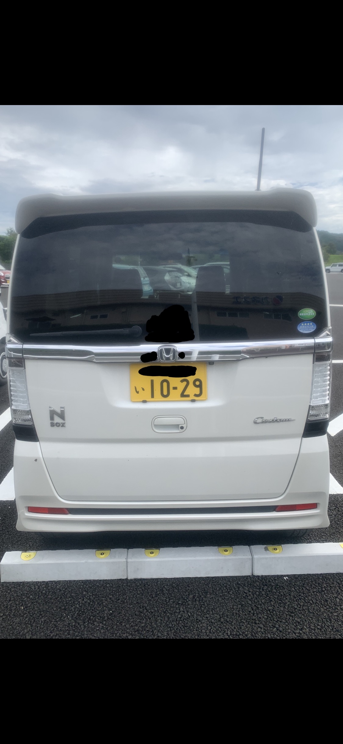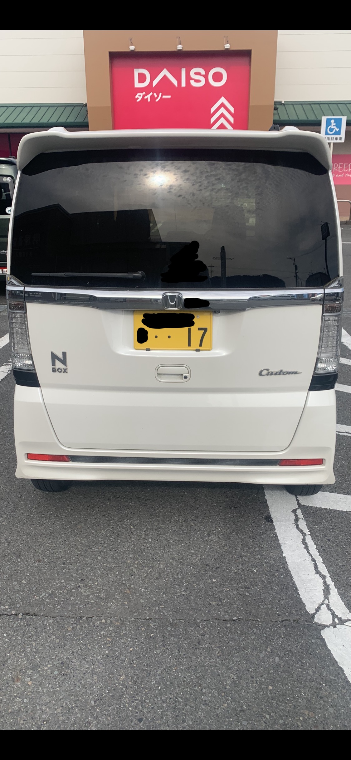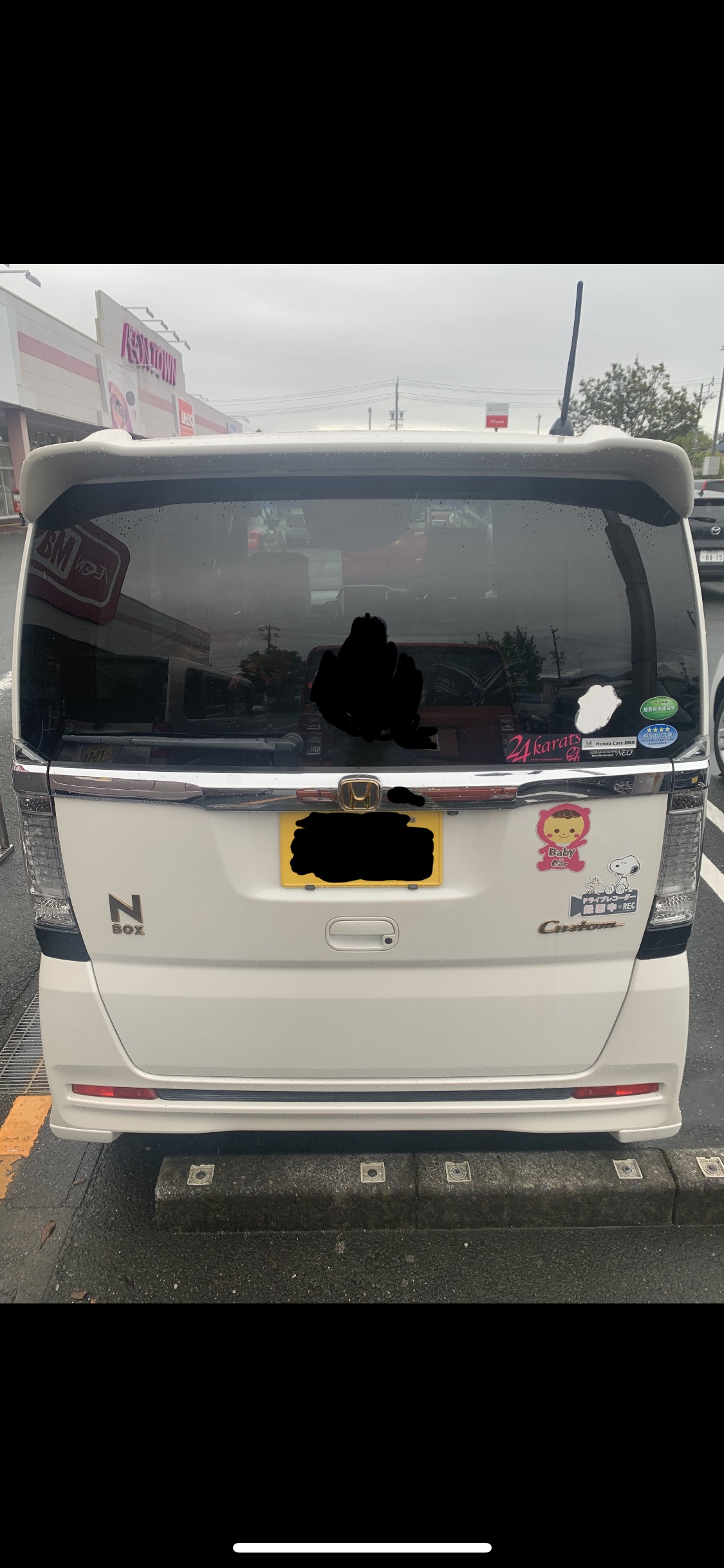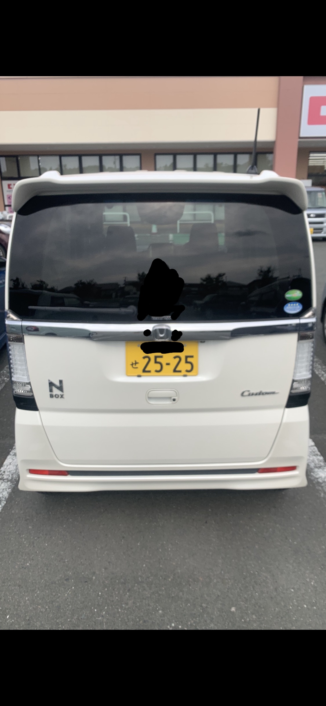 201枚目と同じ馬鹿女が乗る白いNBOXカスタムたん。ドンキーの駐車場に停まって、我慢汁お漏らししてたー!本当白いNBOXカスタムたん可哀想過ぎる!馬鹿女に乗られて