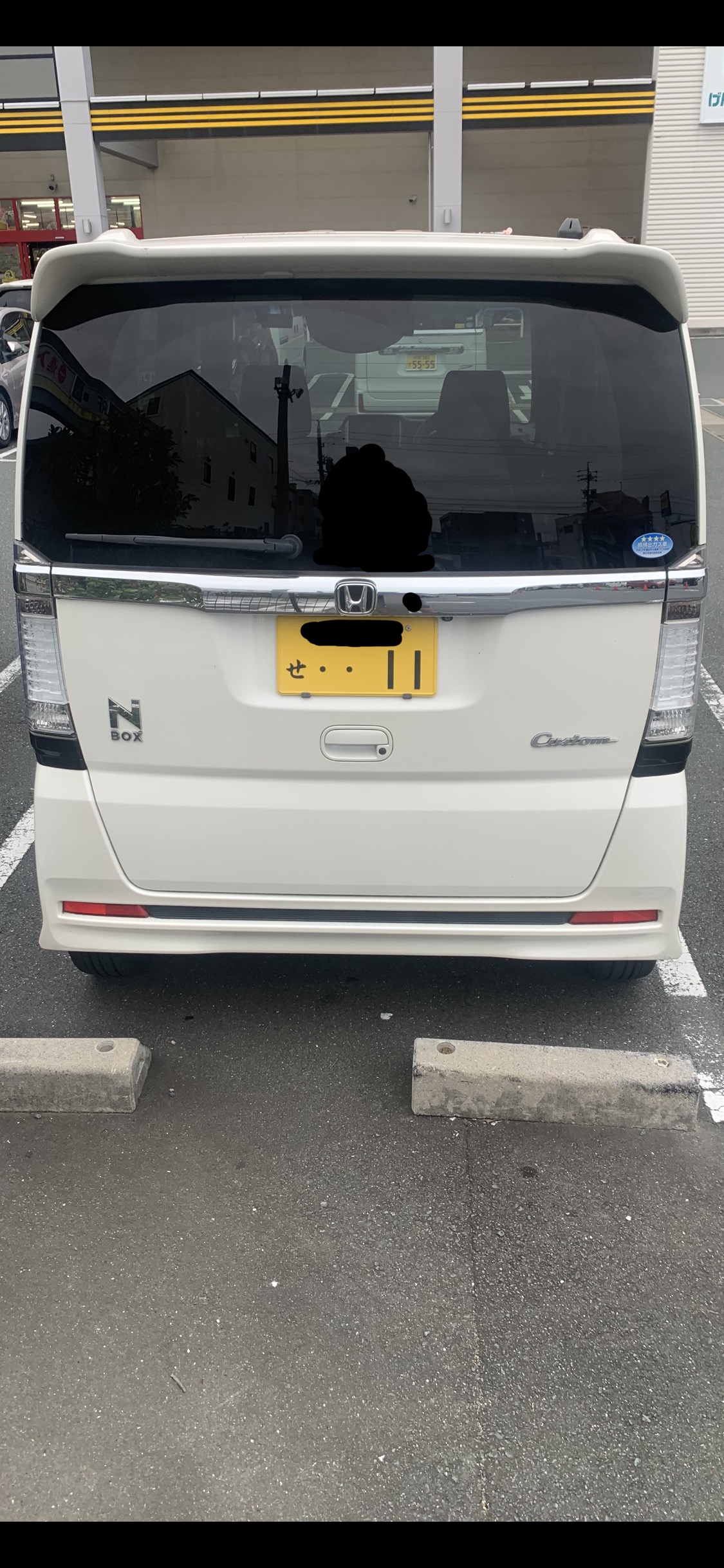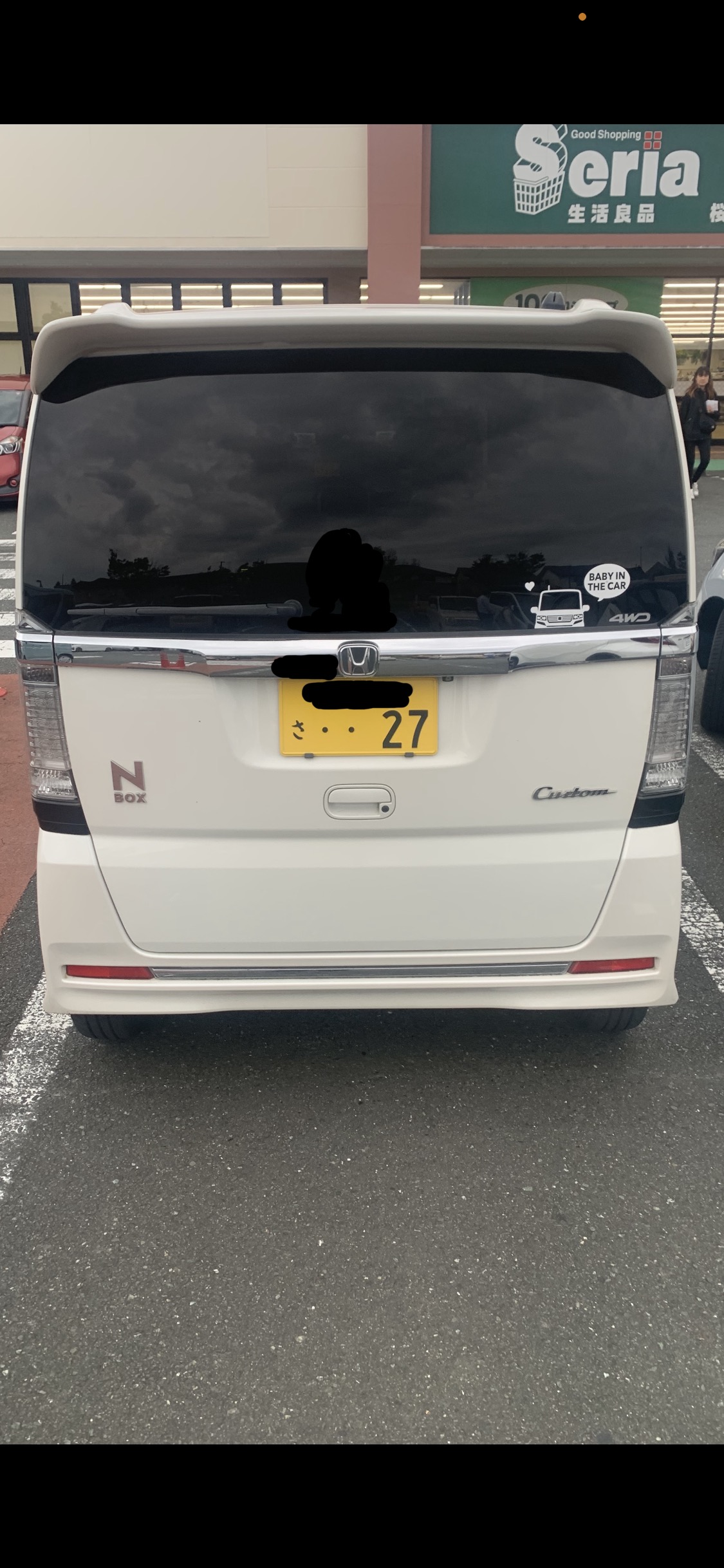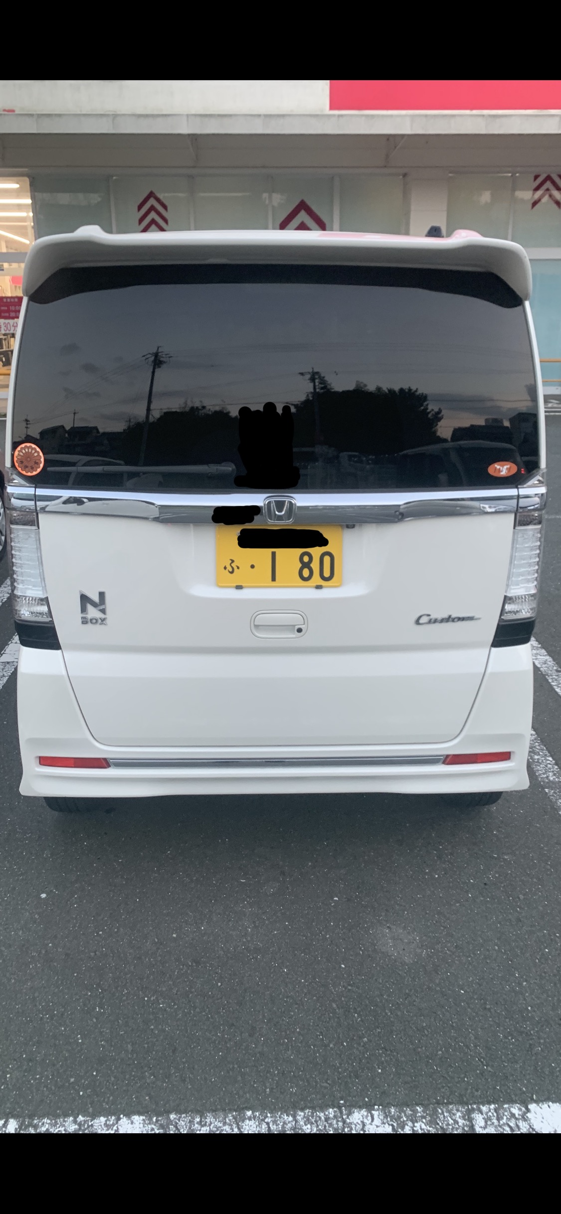 若い髪ロングの馬鹿女が乗る白いNBOXカスタムたんがスーパーの駐車場に居て