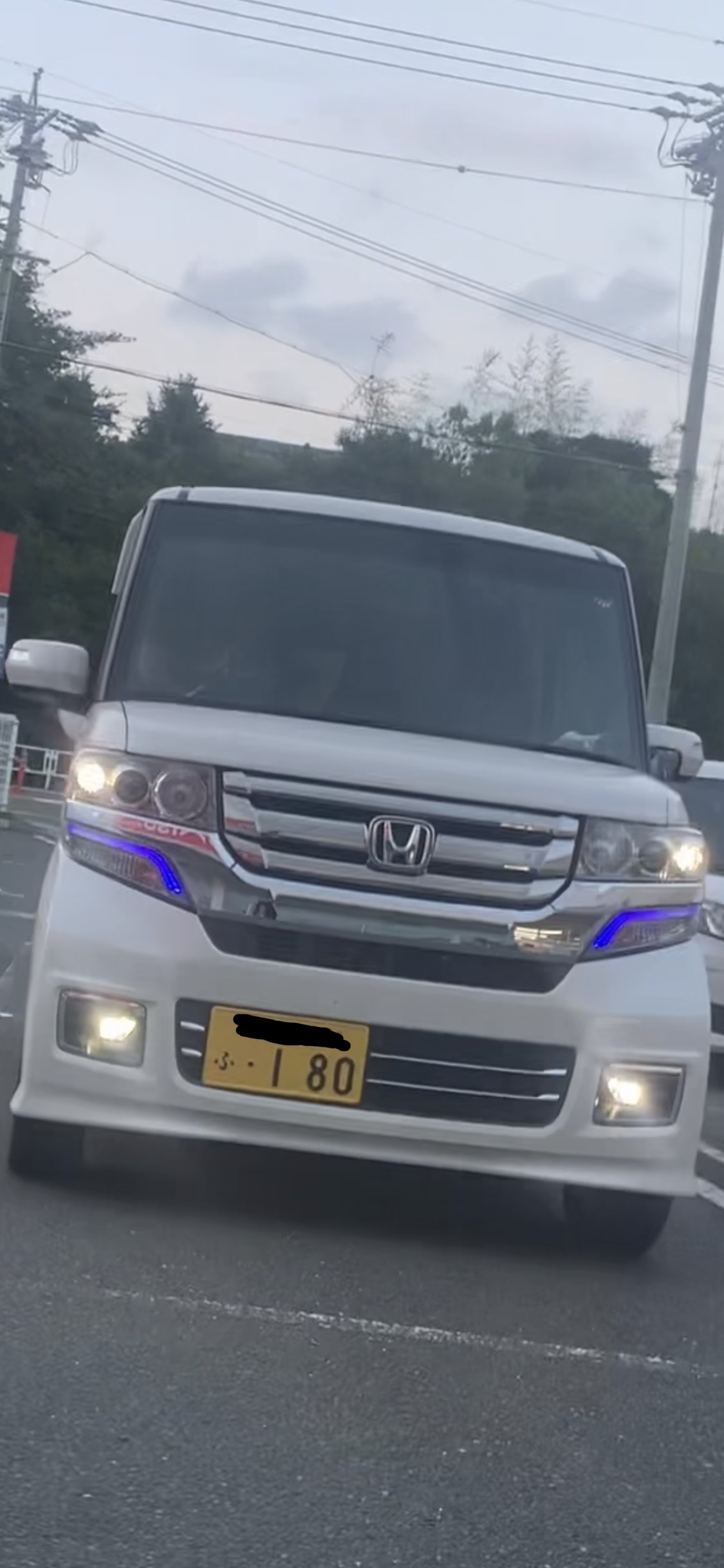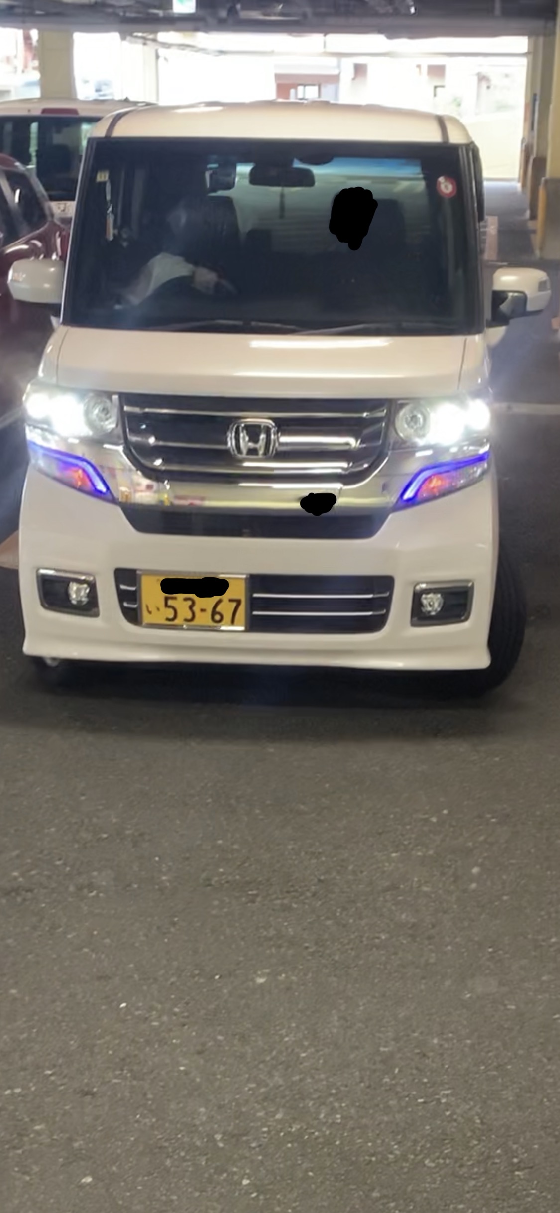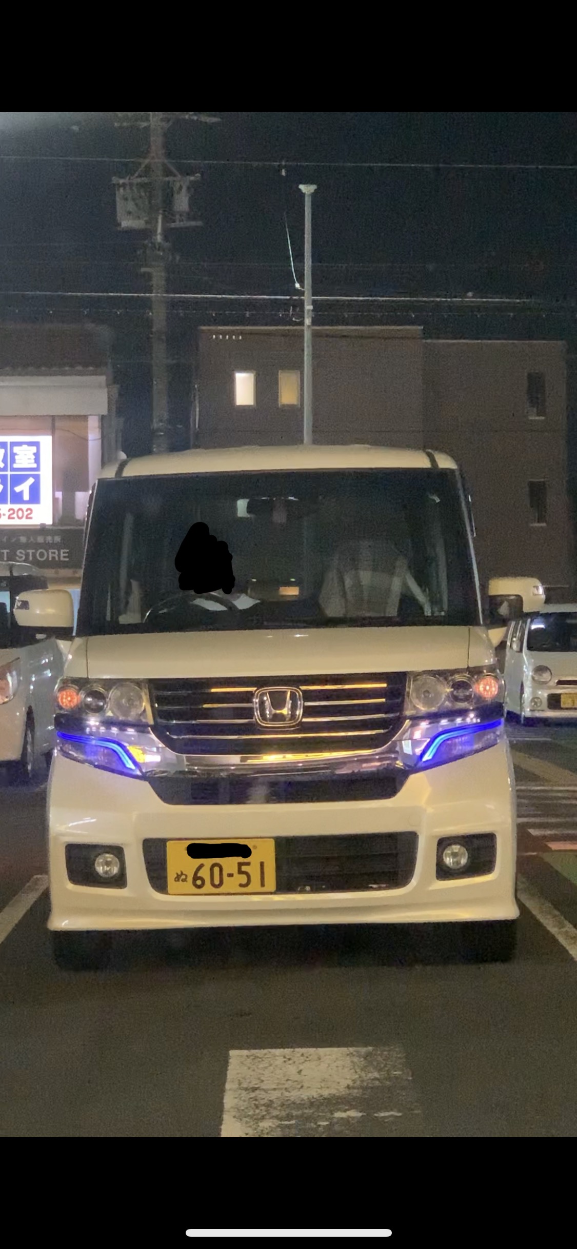 213枚目と同じ若い髪ロングの馬鹿女が乗る白いNBOXカスタムたんがスーパーの駐車場に居て、めっちゃエロい青いLEDつけてた