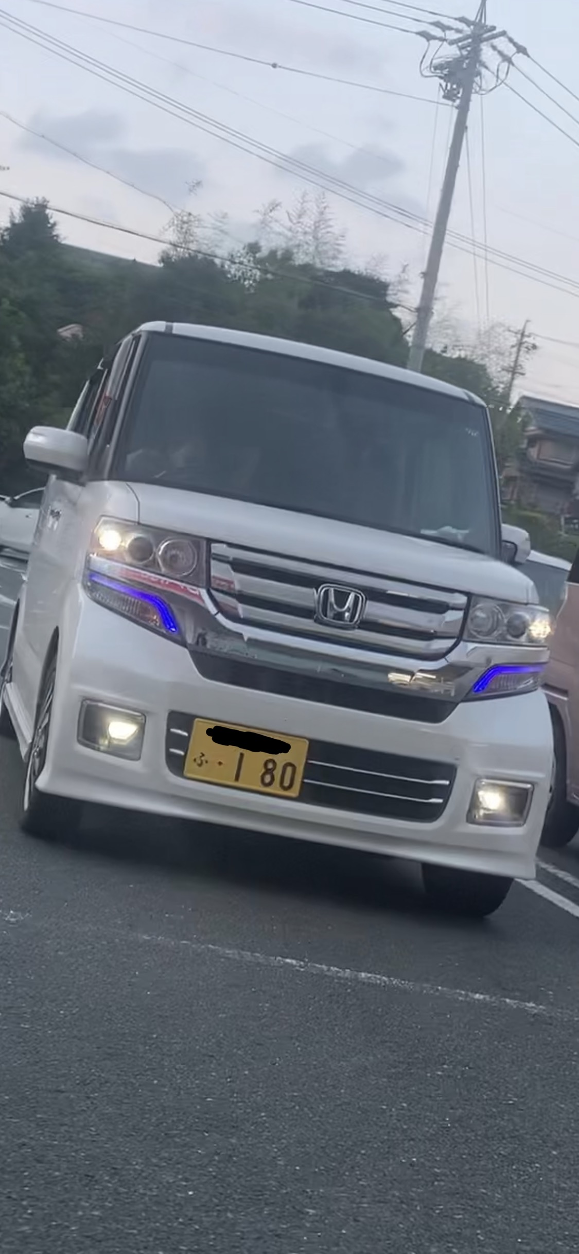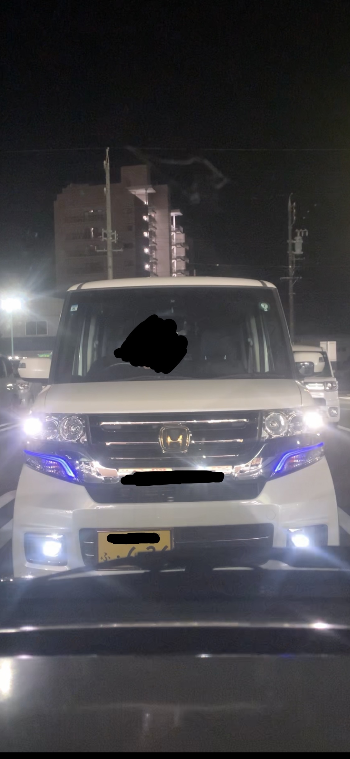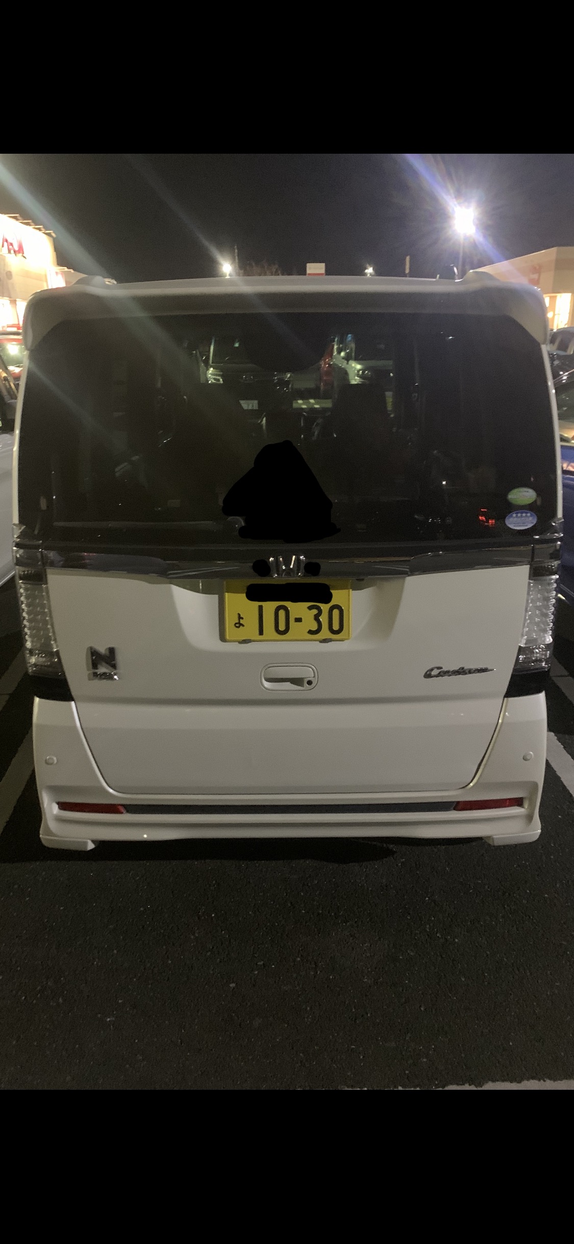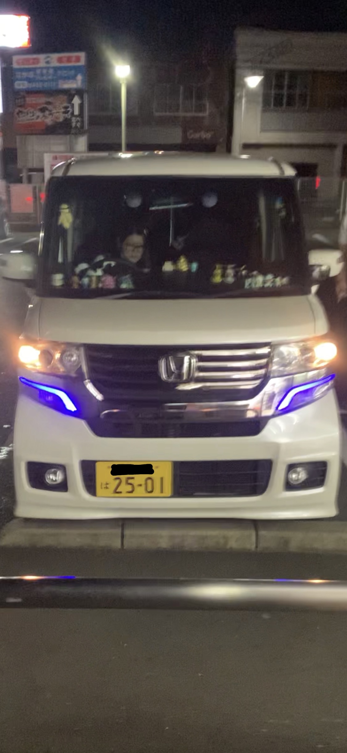 213枚目と同じ若い髪ロングの馬鹿女が乗る白いNBOXカスタムたんがスーパーの駐車場に居て、めっちゃエロい青いLEDつけてた