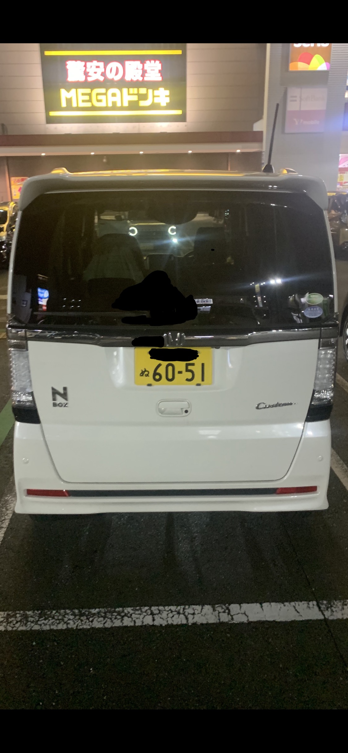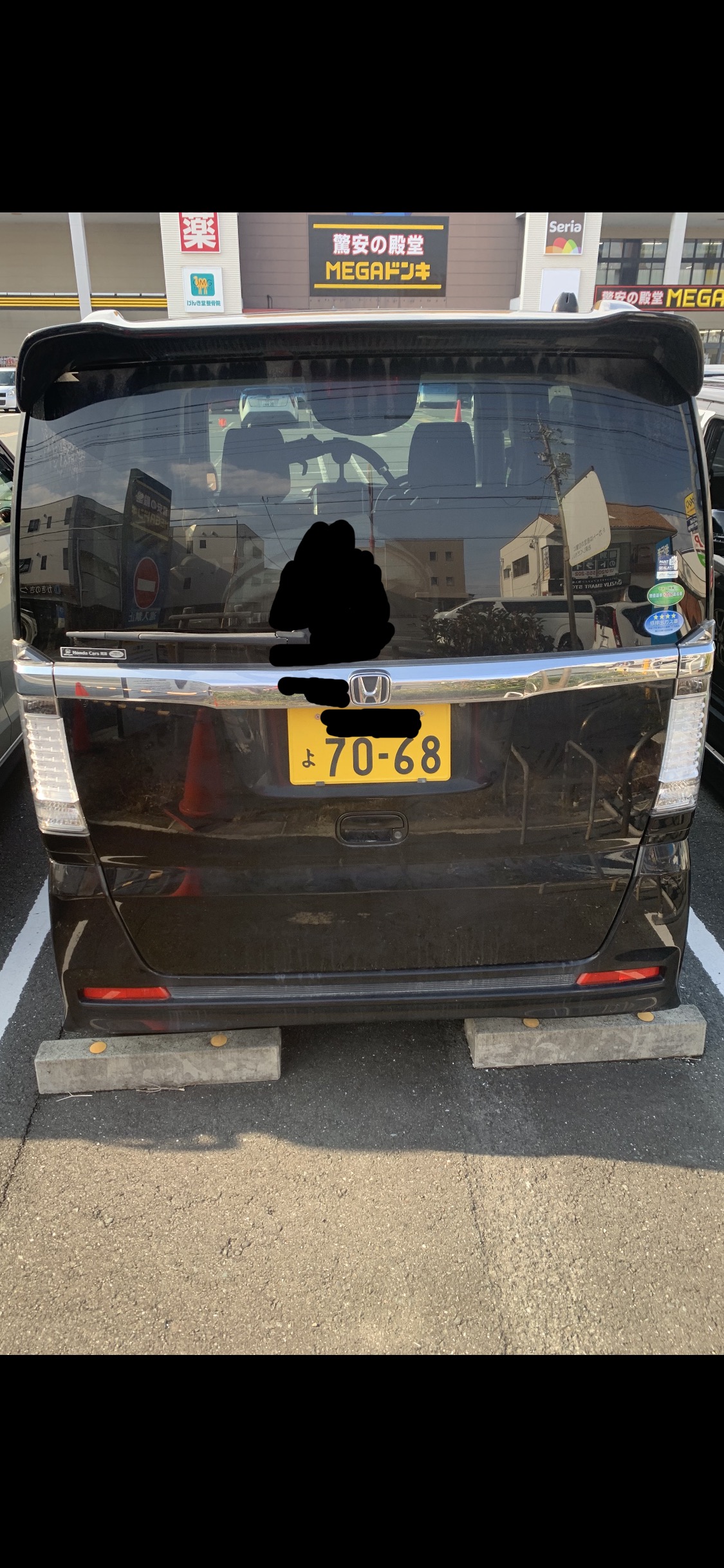 若い茶髪のロングの馬鹿女が乗る黒いNBOXカスタムたんが、ドンキーの駐車場に停まってて
